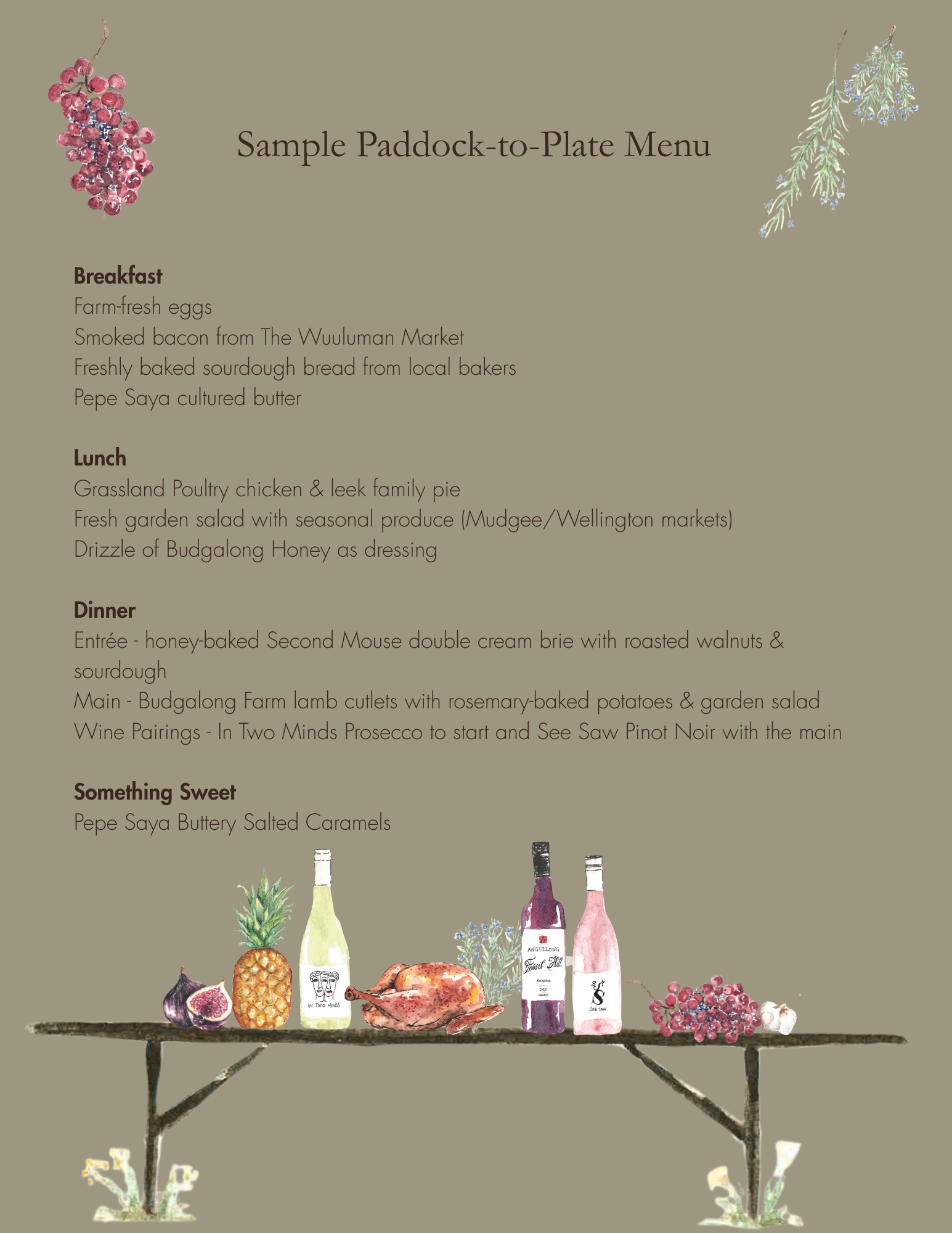 Dining at Budgalong is more than a meal — it's a moment to pause and feel the place you're in. Our Paddock-to-Plate table brings together the best of our farm and the local makers we're proud to call neighbours. Every dish carries the care of the hands that grew, raised, and crafted it.